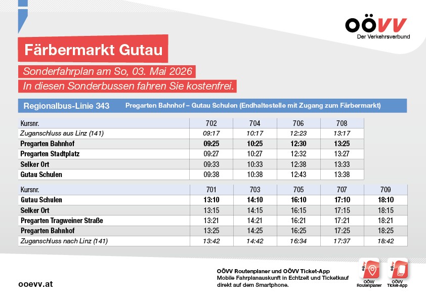 Heuer kann der Färbermarkt entspannt, einfach und umweltschonend mit dem öffentlichen Verkehr erreicht werden. Sparen Sie sich die Parkplatzsuche und kommen Sie entspannt beim Färbermarkt in Gutau an.